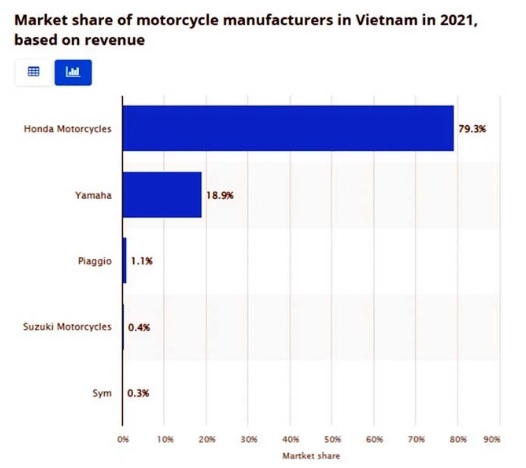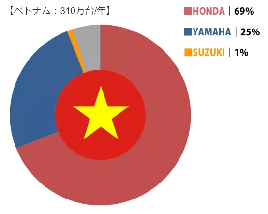 ベトナムではバイクのことを「ホンダ」と呼ぶというのは有名な話だ。これはベトナムのバイク市場におけるホンダのシェアが高いことを示しており、2019年の販売台数ではホンダだけで79%を占めたという。ベトナムのバイク市場にはスズキやヤマハも参入しており、日本メーカーが圧倒的なシェアを占めているようだ。