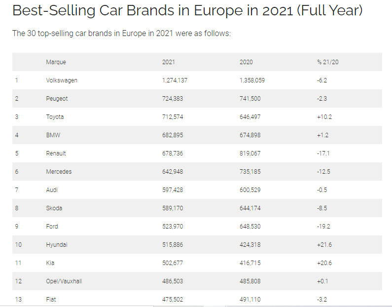 1위는 점유율 24.1%의 폭스바겐그룹이었고, 2위는 스텔란티스(19.4%)였다. 르노그룹은 9.3%로 현대차그룹에 3위 자리를 내주고 4위로 내려앉았다.