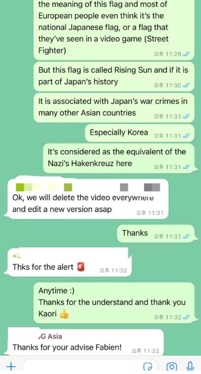 그는 해당 영상에 직접 댓글을 달아 욱일기가 가진 의미에 대해 설명했고 수정해달라고 요청했다.