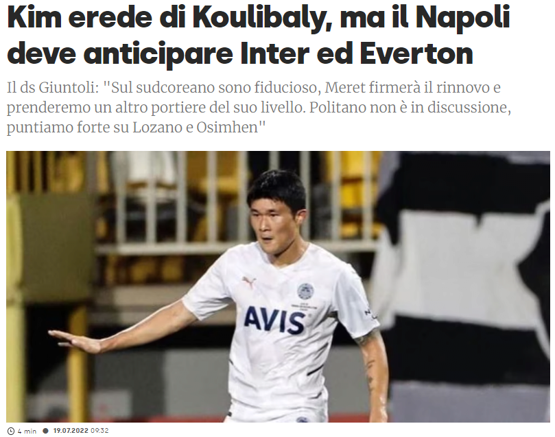 나폴리가 쿨리발리의 대체자로 김민재를 원하는 건 더 이상 비밀이 아니다. 그들은 이적료(28억 1,962만엔)를 일시불로 지불한다는 조건으로 렌과의 경쟁을 뿌리쳤다.