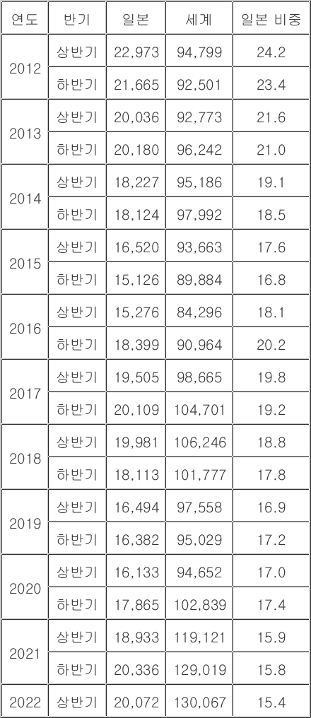 2022년 상반기 일본製素部裝 의존도 역대 최저 기록!