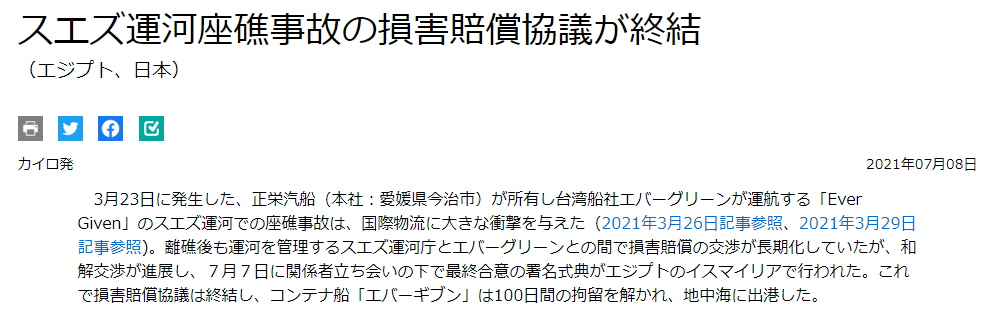 3月23日に発生した、正栄汽船(本社:愛媛県今治市)が所有し台湾船社エバーグリーンが運航する「Ever Given」のスエズ運河での座礁事故は、国際物流に大きな衝撃を与えた(2021年3月26日記事参照、2021年3月29日記事参照)。離礁後も運河を管理するスエズ運河庁とエバーグリーンとの間で損害賠償の交渉が長期化していたが、和解交渉が進展し、7月7日に関係者立ち会いの下で最終合意の署名式典がエジプトのイスマイリアで行われた。これで損害賠償協議は終結し、コンテナ船「エバーギブン」は100日間の拘留を解かれ、地中海に出港した。