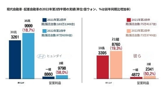 1ㅇㅇ2022/07/23(Sat) 21:47:36ID:Y4MTE2NDY(1/1)NG報告현대차 2분기 실적매출 35조 9999억원 영업이익 2조 9798억원(3,094억 959만엔)KIA 2분기 실적매출 21조 8760억원영업이익 2조 2341억원(2,319억 7,931만엔)>>3>>4>>5>>6>>7>>8>>9>>11>>12>>13>>14>>15>>16>>18>>19>>20>>21>>22>>39>>480