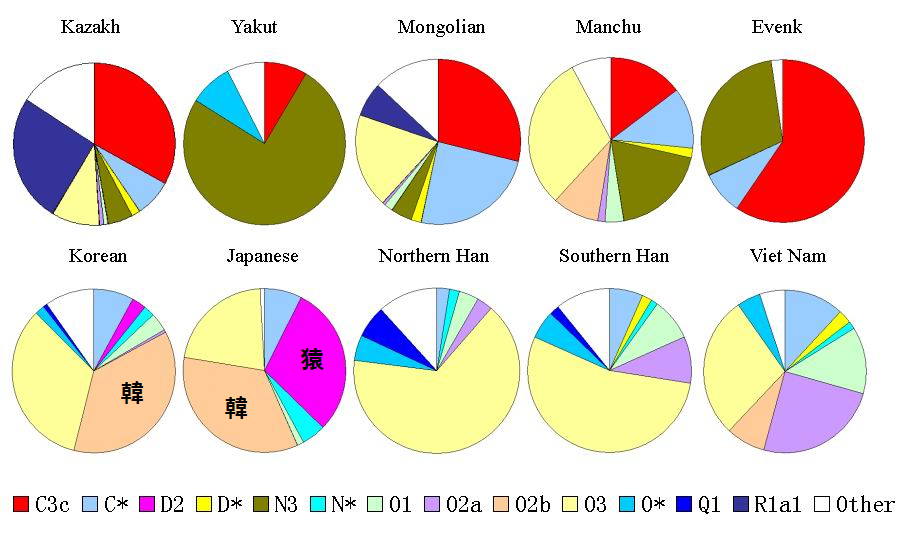 それが惨めだと気が付かないのは、何代にもわたって長年成り済ましを続けてきたせいなのか?朝鮮民族の遺伝子組成のことで言えば、満州族、漢民族、蒙古族、ツングース系民族に、先住民の痕跡として古代日本人(縄文人)の要素が僅かに含まれている。韃靼人(チュルク系)の要素が含まれているという説もある。