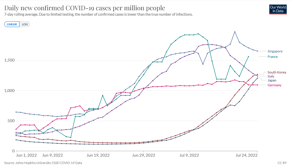 NHKによると、23日日本全国新型コロナ感染者は20万975人で4日連続で最多となった。東京だけで3万2698人となり、3日連続で3万人を超えた。日本では感染力が強いオミクロン株の下位変異「BA.5」が急速に広がり「第7波の流行」が本格化している。国立感染症研究所は日本全国の新規感染者の中でBA.5が占める割合が8月第一週目にはほぼ100%に達するものと予想した。