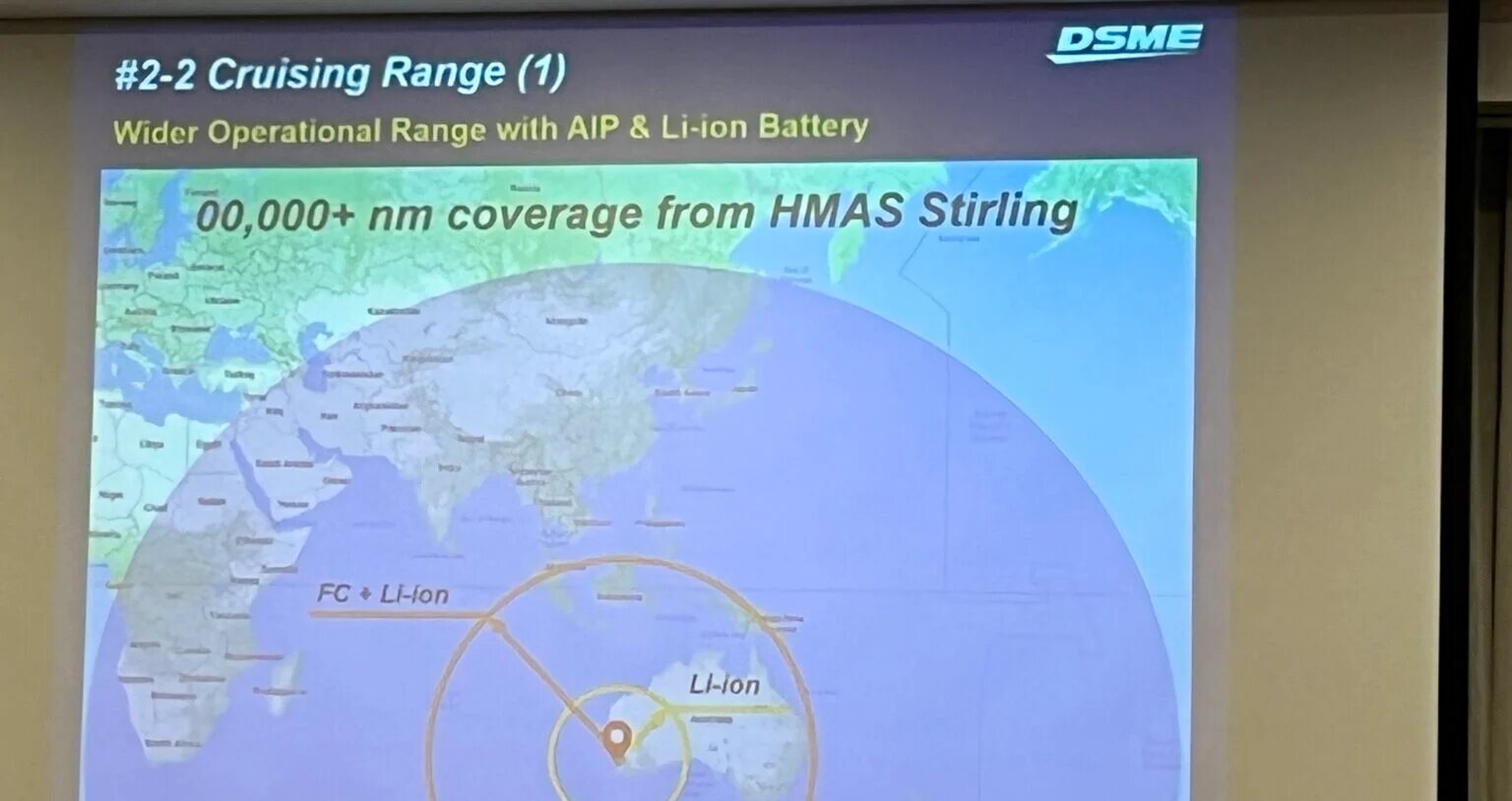 한국인들은 저녁 식사 동안 AIP 시스템에 동력을 공급하는 큰 리튬 배터리를 언급하며 거의 그들의 발표에 열정적이었다. 3,700톤급 보트의 항속거리는 아래 차트와 같이 장거리 순항 시 사용되는 첨단 디젤 엔진과 AIP의 결합으로 인해 커집니다. 한국인들은 또한 잠수함이 승무원의 사기 진작과 효율성을 높이기 위한 의도적인 시도로 편안한 숙소를 자랑한다고 말했다.
