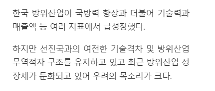 しかし、先進国との依然として技術格差や防衛産業の貿易赤字構造を維持しており、