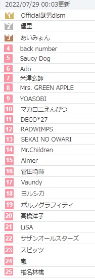 因みに、林檎姐さんは、JOYSOUND アーティスト別カラオケランキング(最新)で、25位と、日本の若者に絶大な人気を長らく維持しております。>>1