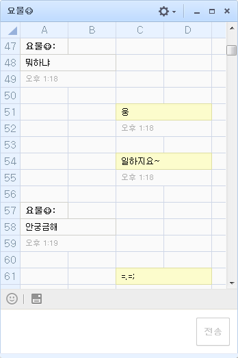 본인도 한국의 회사에서 일을 하면서 느끼는 것이지만, 한국인들은 업무몰입도가 도저히 쓸 수 없을 정도로 낮습니다. 동료와 잡담은 기본, 커피를 마시러 간다며 한시간 쯤 사라지지를 않나, 업무시간에 개인 메신저를 이용해 친구와 채팅을 합니다. 상사에게 지적을 당하지 않기 위해서 아래의 사진과 같이 카카오톡에 스킨을 적용합니다. 즉 카카오톡을 엑셀 프로그램과 같이 위장하는 것입니다. 본인의 후배도 그것을 사용하길래 뭐하는 짓이냐고 물어보니, 전혀 부끄럽게 생각하지 않습니다.