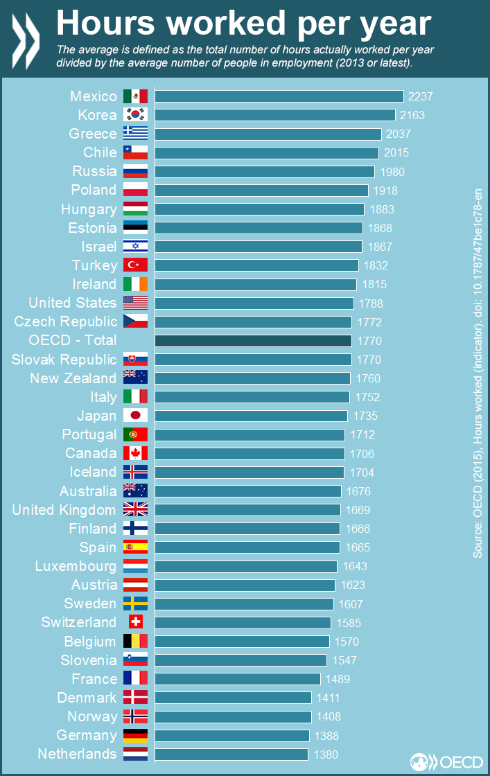 한국인의 근무시간은 아주 긴 편입니다. 연간 2100시간 수준으로 OECD평균의 1700시간보다 매우 긴 시간입니다. 물론 한국인들은 저 노동시간은 대기업등의 좋은 직장에서 하는 노동시간이지, 실제의 노동 시간은 더 길다고 성토를 합니다.