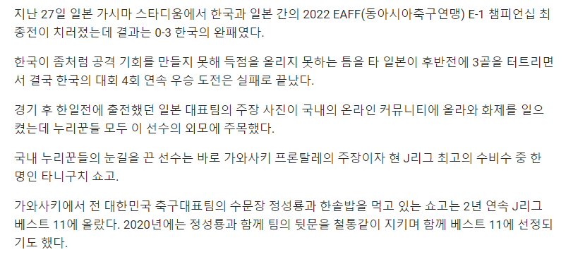 試合後、韓日戦に出場した日本代表チームの主将写真が国内のオンラインコミュニティに掲載され話題を呼んだが、ネチズンたちは皆李選手の外貌に注目した。