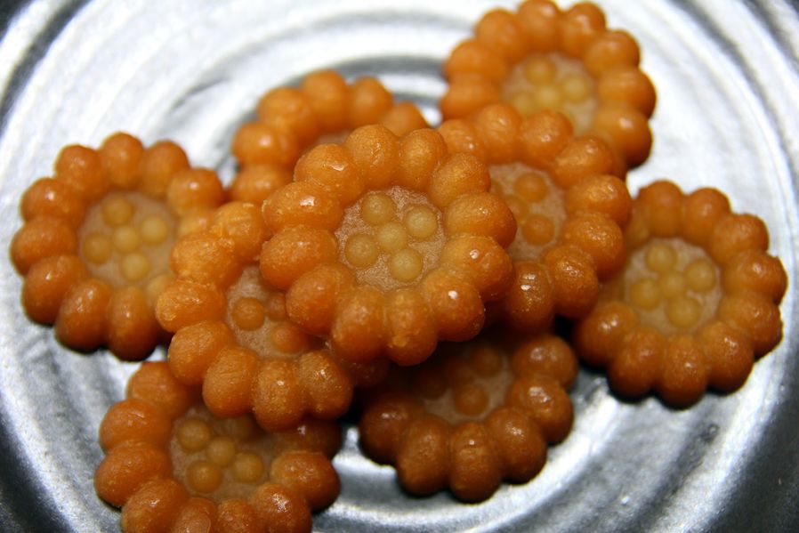 [yu gwa] : 바삭한 쌀반죽 튀김에 쌀알 튀김을 꿀, 물엿으로 붙인 과자. 바삭한 식감.