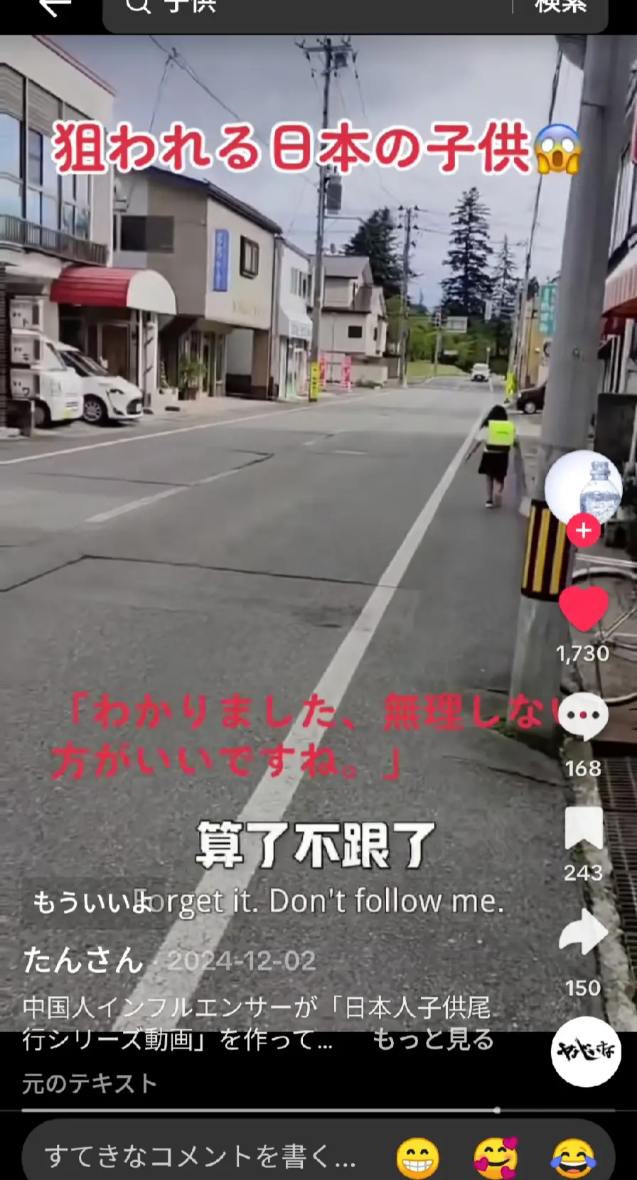※ 日本人で子を持つ人は注意を。在日中国人達が日本の子供達の通学路とその様子、ひと気のない処などを地名付きで中国内に拡散している。中国人に因る誘拐は、日本を含めた世界各地で逮捕者や記録、報告がされてます。路上駐車や停車中の車からは距離を空けて通行する事と、子供を連れてる際に中国人から声を掛けられても子供から眼を離さない事(油断させもう1人が拐う)を徹底してください。子供を撮影する中国人がいたら、ふん捕まえて逮捕させましょう。日本では10歳以下の子供だけで、年間1000人を超える行方不明者が出ていて、世界の各地でも中国人女に因る誘拐の逮捕者や報告が出てます。10歳以下の子供にしか生成されない脳にある【物質】を採取する為等で、実際に流通しているそうです。(日系アメリカ人FBI捜査官の発言) また、中国内で行方不明になった子が臓器を抜かれた状態で発見されてもいます。