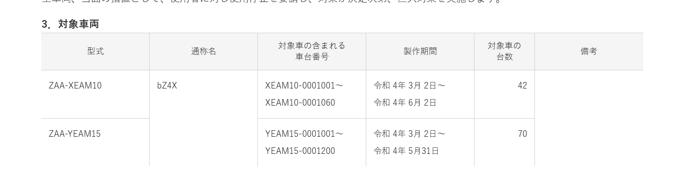 しかし、タイヤ脱落のおそれがあるとして、2022年6月23日にリコールを発表。原因を調査中とし、修理・点検といった具体的な対応についてはまだ発表されておらず、bZ4Xの使用者には使用を停止するよう要請するのみに留まっています。