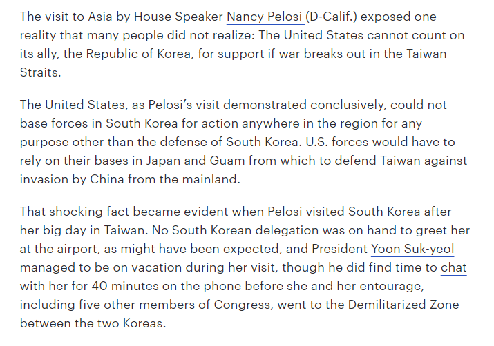 米国は、ペロシ議長の訪問が決定的に示したように、韓国の防衛以外の目的のために、地域のどこでも韓国軍を行動させることはできませんでした。 米軍は、中国の本土からの侵略から台湾を守るために、日本とグアムの基地に頼るしかないだろう。同じ価値観を共有して無いんだから当たり前なんだろ