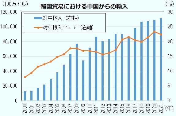 これは、韓国企業が中国に自社(合弁)工場をつくり、そこから必要資材を輸入する量が増えていることとも関係している。