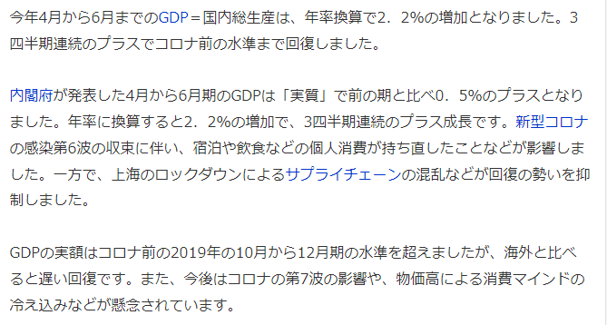 GDPの実額はコロナ前の2019年の10月から12月期の水準を超えましたが、海外と比べると遅い回復です。また、今後はコロナの第7波の影響や、物価高による消費マインドの冷え込みなどが懸念されています。ソースを書けないのでは、朝鮮人と一緒。