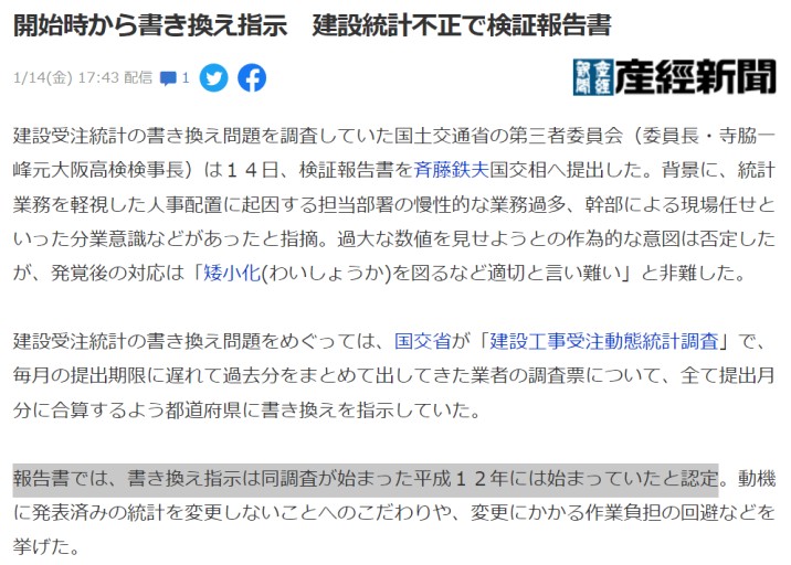 일본의 주요 경제 통계 및 품질 조작사건은 일본의 아베 정권 시절에 조직적으로 일본 국토교통성의 건설공사 수주 동태 통계가 지난 8년간 이중 계상으로 조작된게 드러나서 이슈가 되고 있습니다.