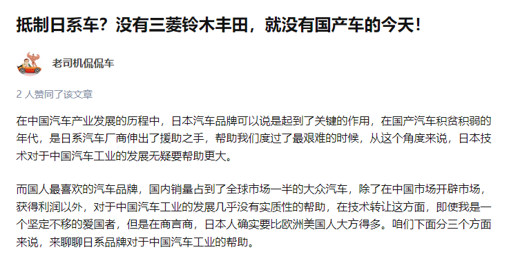 >2022年8月15日、中国の自動車情報サイト・易車に、「日本車をボイコット?三菱、スズキ、トヨタがいなければ国産車の今はなかった!」とする文章が掲載された。