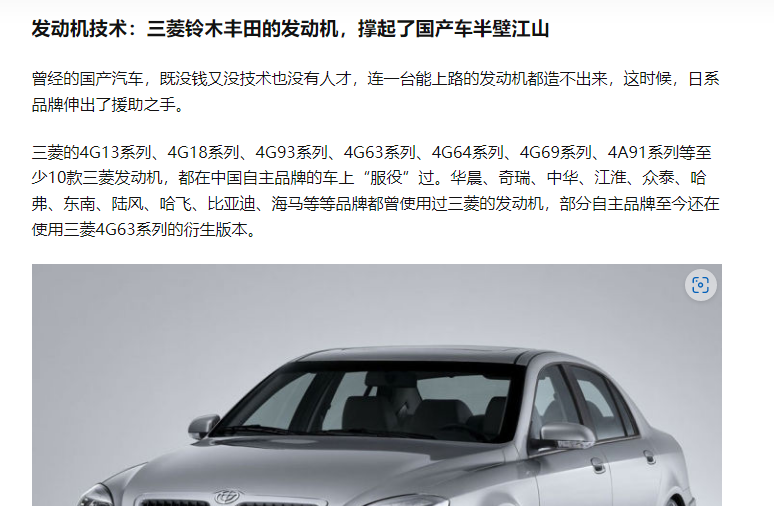 まず、エンジン技術だ。かつての国産自動車は、お金も技術も人材もなく、自力ではエンジンさえも造れなかった。その時支援してくれたのが日本のブランドだ。三菱の4G13シリーズなど少なくとも10種類のエンジンが中国ブランドの自動車に「就役」し、スズキのG13、F10シリーズエンジンも人気車種に用いられた。トヨタの1ZZ-FE、5A型シリーズ、8A型シリーズは数多くの車種に採用され、吉利汽車は創業時にトヨタ製エンジンを大量に用いた。三菱、スズキ、トヨタの3社がなければ、中国ブランドは車1台すら造れず、現在の成長もなかったのである。