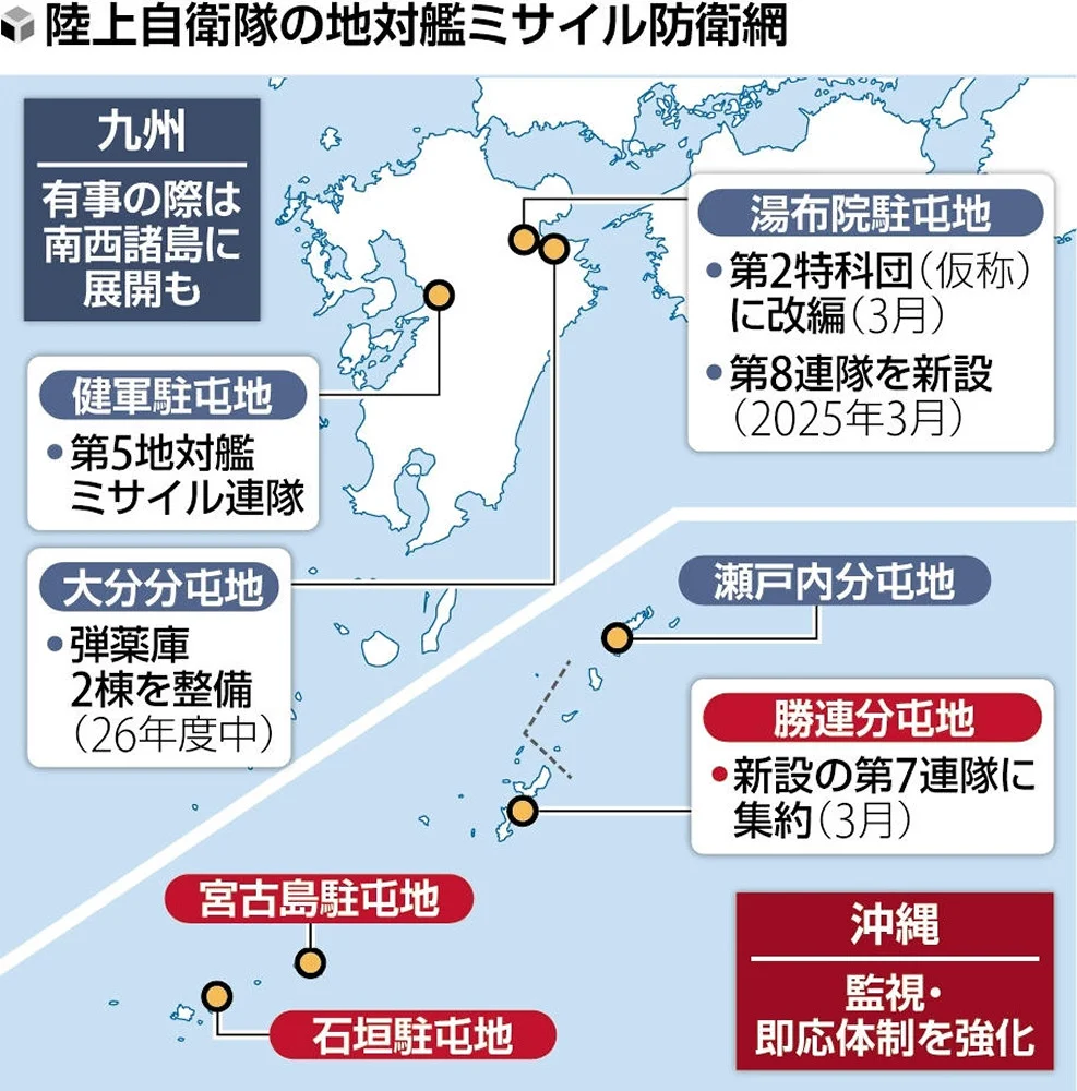 既存の第5地対艦ミサイル連隊(熊本市の健軍駐屯地)に加え、新たに第7、第8の2個連隊をつくる。24年3月をめどに勝連分屯地(沖縄県うるま市)に誕生する第7連隊には、第5連隊傘下の瀬戸内分屯地(鹿児島県瀬戸内町)、宮古島駐屯地(沖縄県宮古島市)、石垣駐屯地(同県石垣市)の部隊を移し、離島防衛能力を集約する。これにより、配備済みの地対空誘導弾部隊とともに、南西諸島に接近を図る他国軍に対する警戒監視網が整う。