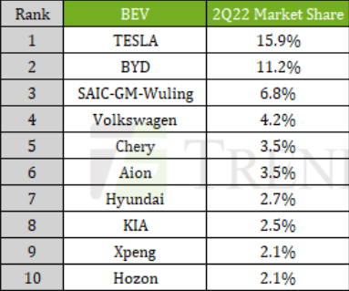 중국 상하이자동차와 미국 GM의 중국합작사 상하이GM우링(SAIC-GM-Wuiling)은 비야디에 이어 3위로 점유율 6.8%를 기록했다. 현대와 기아는 각각 7위와 8위다. 트렌드포스는 “중국은 주요 EV시장이지만 현대와 기아는 중국을 중요한 시장으로 삼지 않고도 상위 10개 업체 안에 들었다”고 언급했다. 고급 자동차 제조사인 BMW와 메르세데스-벤츠는 EV 전환에 속도를 내면서 각각 12위와 14위를 차지했다.