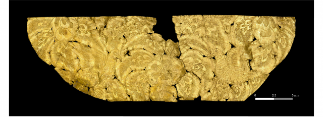 출토 당시 금박유물은 형체를 구분하기 힘들 정도로 구겨져 20m 가량 서로 떨어진 채로 발견됐다. 보존처리 과정을 통해 두 점이 하나로 연결됐던 것임이 확인됐다. 금박은 순도 99.99%의 정선된 순금 0.3g을 두께 0.04mm로 얇게 펴서 제작됐다. 얇은 종이 수준이다. 가로 3.6cm, 세로 1.17cm 크기의 평면에 새와 꽃을 조밀하게 새겼다.