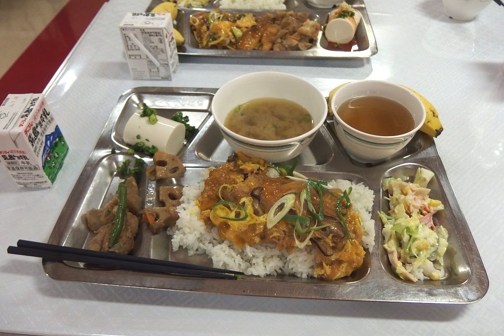 Aさんが共有した写真では朝食のメニューとして焼き餃子3つと牛乳、ごまのお粥が見られる。またその日の昼食のメニューはトンカツとサラダ、夕食のメニューにはご飯とスープ、キムチとちょっとしたおかずだ。