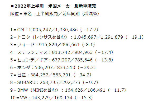 2022年上半期(1〜6月)の米国新車販売をメーカー別に整理すると、GMが109万5,247台を販売してトップだった。2位は104万5,697台でトヨタが続いた。第1四半期(1〜3月)時点では、51万4,592台でトヨタがGM(51万2,846台)をリードしていたが、第2四半期でGMが逆転したことになる。GMの好調は、トラックが原動力になっている。シボレー・シルバラードとGMCシエラで20万3,041台を販売。GM全体の約35%をこの2台で占めている。