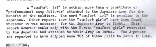 慰安婦について日本軍に追随する娼婦、もしくは、プロフェッショナル・キャンプ・フォロワー(職業的な野営随行者)以外のなにものでもなく、この用語は日本軍特有のものだと説明されている。この文書以外にも、日本軍にとって戦闘の必要のある場所ではどこにでも「慰安婦」が存在してきたことを示す報告があるとも述べられている。