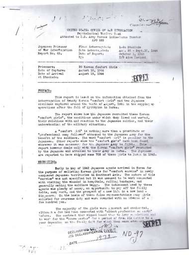 この文書自体の説明として、慰安婦の募集方法、慰安婦の生活および労働の条件、日本軍兵士と慰安婦の関係、軍事情勢についての慰安婦の理解程度についての報告であると述べられている。