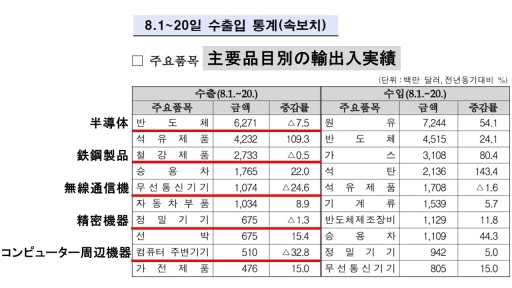 2022年08月22日、関税庁から「2022年08月01~20日輸出入の現状」のデータが公表されたのですが、非常に興味深い部分があります。主要品目別の輸出入動向なのですが……以下をご覧ください。