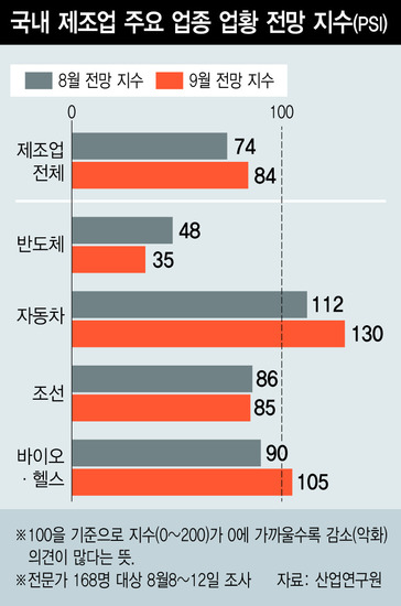 調査対象の10業種のうち、前月比で下落した業種は半導体と造船だけだった。造船業界の展望指数は86から85に下がった。9月の展望指数が最も上昇した業種は自動車部門だ。前月比で18ポイント高い130であることが調査で分かった。鉄鋼とバイオ・ヘルスケアも基準点(100)を上回り、それぞれ108(+58)と105(+14)であることが調査で分かった。電子(携帯電話・家電)の展望指数は66から79に上昇した。詳しく見てみると、家電は75から56に下がり、携帯電話は60から92と大幅に高まった。