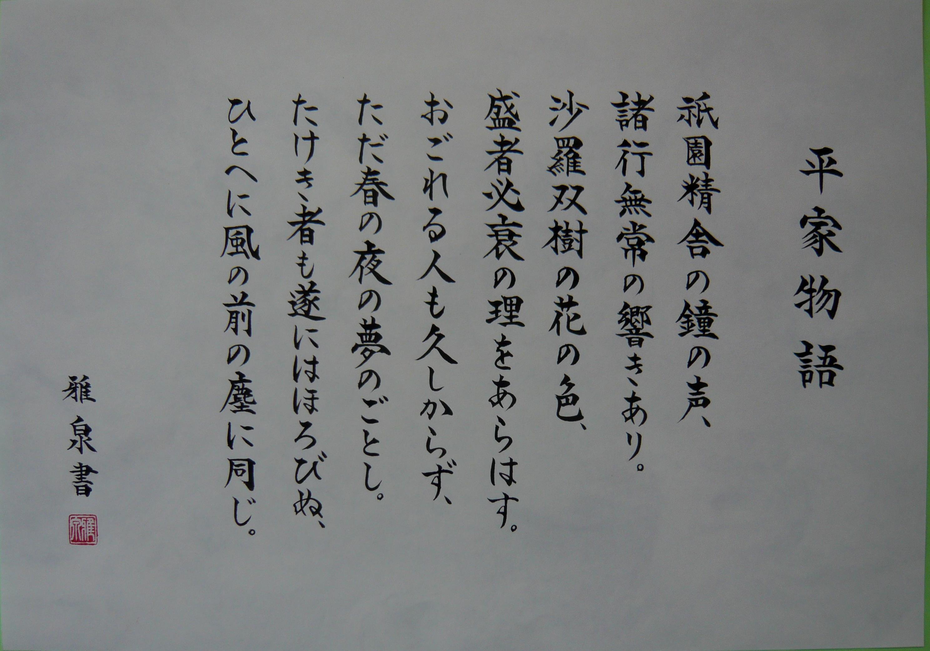 何故平家物語なのかは汲み取れませぬが、字が綺麗。終わるな。