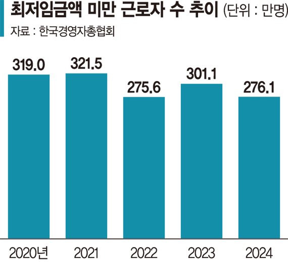 韓国経営者総協会(軽総)は11日「2024年最低賃金未満率分析」報告書を通じてこのように明らかにした。報告書によると、2001年57万7000人水準だった最低賃金額未満の労働者数は昨年276万1000人で378.5%急増した。同期間最低賃金未満率も4.3%から12.5%に3倍近く増えた。