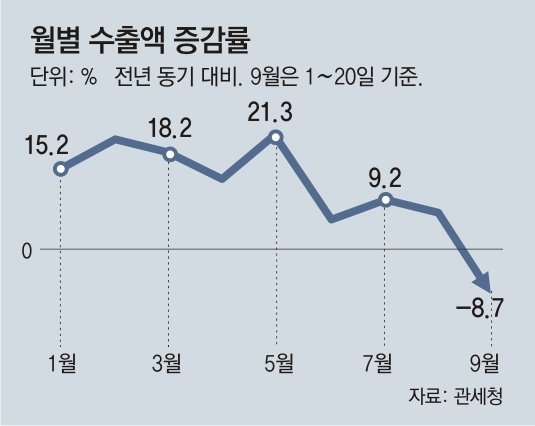 9月1-20日の輸出が前年同期比で8%以上減少した。関税庁によると、今月1-20日の輸出額(通関基準暫定値)は329億5800万ドル(約4兆7400億円)と、前年同期比8.7%減となった。