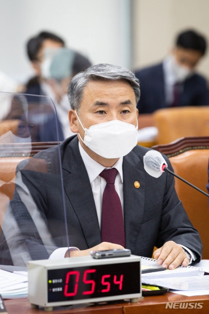 이 장관은 29일 국회 국방위원회에서 일본 관함식 참여 여부에 관한 정의당 배진교 의원 질의에 "일본 욱일기는 오래전부터 지속적으로 사용해왔다"며 "과거는 (일본이 관함식에서) 욱일기를 게양했더라도 우리가 참관했다"고 답했다.