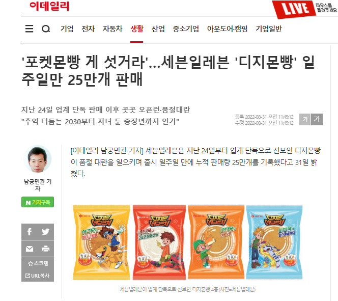 記事によると、韓国のセブンイレブンで24日から販売されているデジモンパンは1週間の売り上げが25万個を記録した。デジモンパン人気により、24~30日のセブンイレブンのパン全体の売り上げも前年同期比約2倍に増えたという。