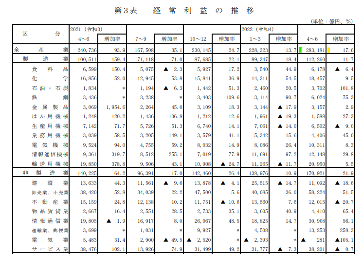 2022年1月~6月の経常利益は51兆1504億円、売上高が697兆7538億円