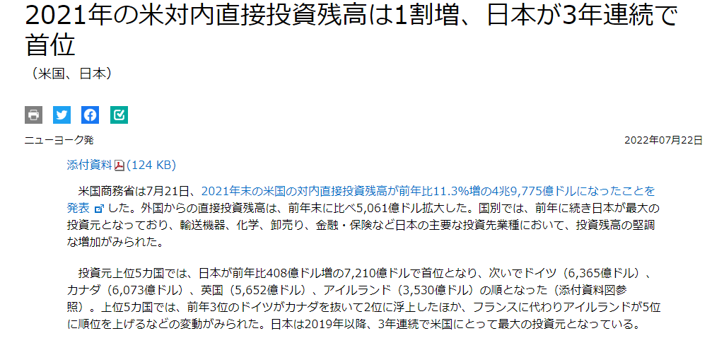 2021年の米対内直接投資残高は1割増、日本が3年連続で首位