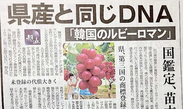 一方、韓国内でルビーロマンを新品種として保護する登録はされていない。石川県が最初の流通から六年以内に出願しなかったためで、誰でも申告すれば生産・販売できるのが現状だ。これまでに二十五の農業法人などが申告を済ませている。