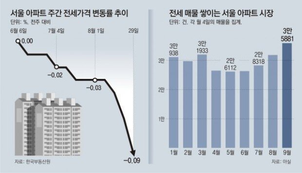 4日、不動産ビッグデータ会社のアシル(マンション実取引価格)によると、同日基準でソウルマンションの伝貰物件は3万5881件で、1ヵ月前(3万1781件)比12.9%増加した。1年前(2万2734件)に比べると57.8%増加した。このように伝貰物件が増え、ソウルのマンションの伝貰価格もやはり1月第3週(17日基準)の0.01%上昇を最後に、8月第4週(29日基準)まで32週間連続上昇できなかった。