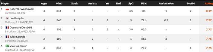 김민재, Lee kangin 세리에A, 스페인 1부리그 누적 평점 2위