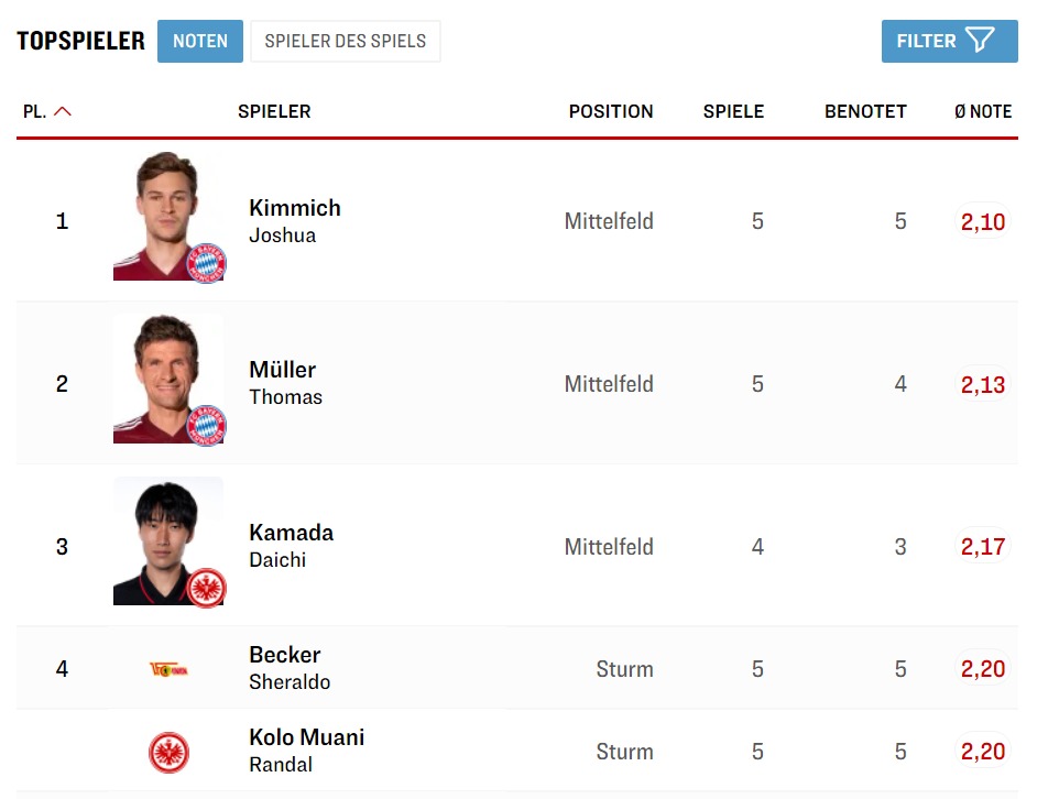 例えば鎌田大地は、現在ブンデスリーガ得点ランキング3位で、Kickerの評価点も3位だが、