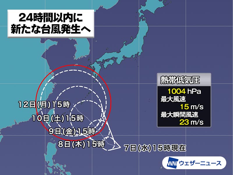 あす8日(木)午後3時までには、フィリピンの東で台風が発生する予想です。台風が発生すれば台風12号になります。
