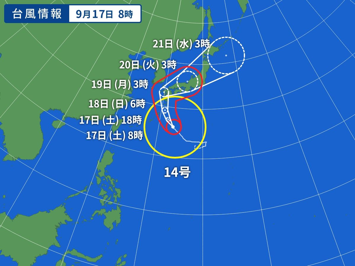 大型で非常に強い台風14号は、日本の南の海上を進んでいます。
