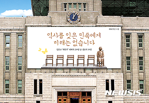 ソウル市は、第98周年三一節(独立運動記念日)を迎えて、ソウル広場前のソウル図書館正面の外壁に「歴史を忘れた民族に未来はありません」という文面と慰安婦「平和の少女像」が印刷された横断幕を掲げると27日、明らかにした。