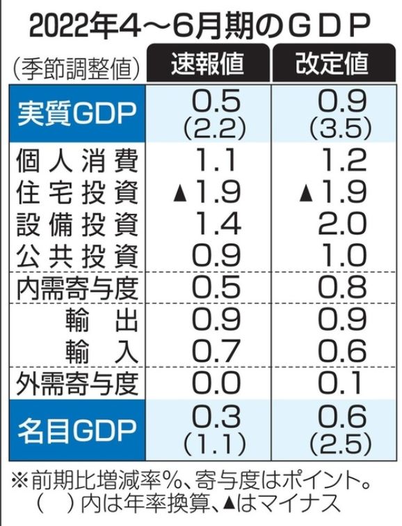内閣府が8日発表した2022年4~6月期の国内総生産(GDP、季節調整値)改定値は、物価変動を除く実質で前期比0.9%増、このペースが1年続くと仮定した年率換算は3.5%増だった。速報値の年率2.2%増から大幅に上方修正した。財務省が1日に発表した法人企業統計で企業の設備投資が堅調だったことを反映した。プラス成長は3四半期連続。