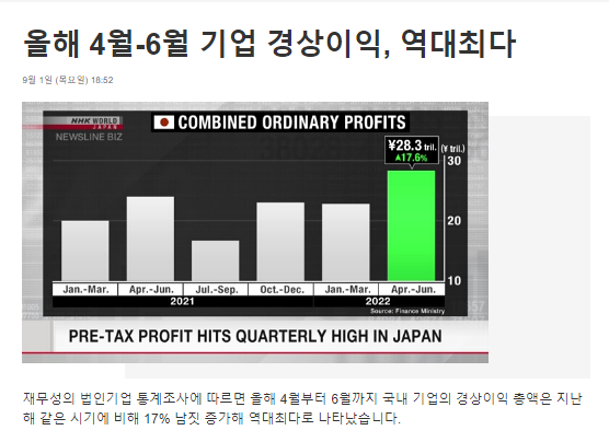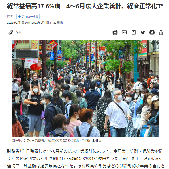 日本人(´・ω・`)4~6月期の法人企業統計によると、全産業(金融・保険業を除く)の経常利益は前年同期比17.6%増の28.3兆円~過去最高益~GDP改定値、3.5%増 4~6月期、大幅上方修正>>11