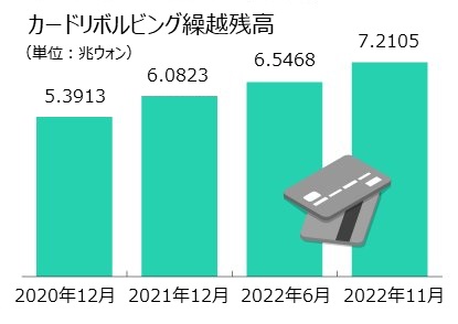 韓国の新韓・サムスン・KB国民・現代・ロッテ・ウリィ・ハナの専業カード会社7社の11月のリボルビング繰越残高は7兆2105億ウォン(約7468億円)で、前月比1349億ウォン増えた。昨年末に比べて1兆1282億ウォン(18.5%)増加した。与信金融協会の調べでわかった。